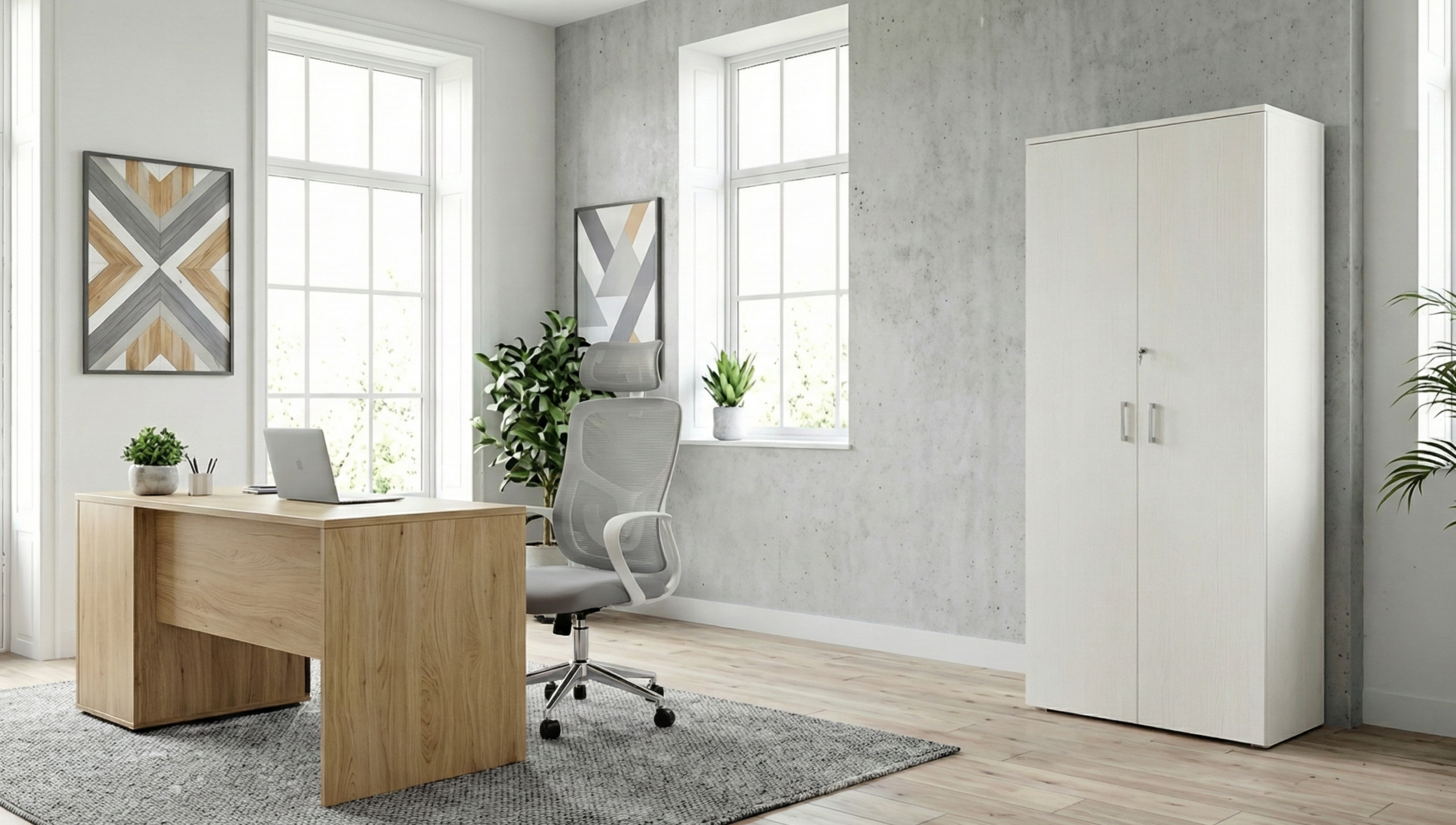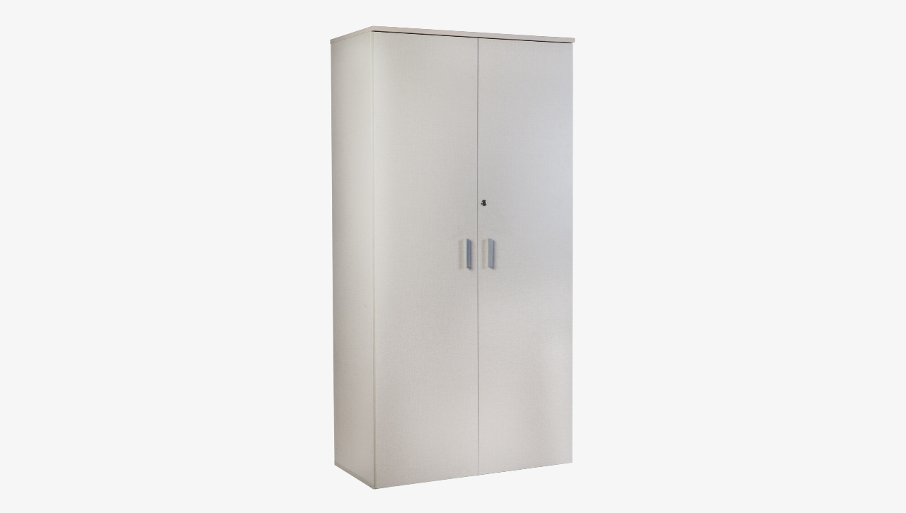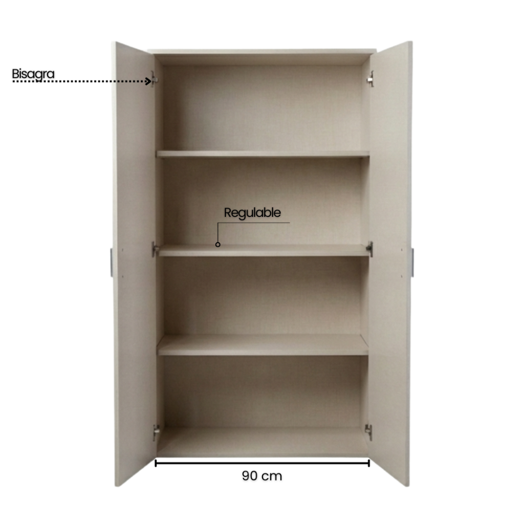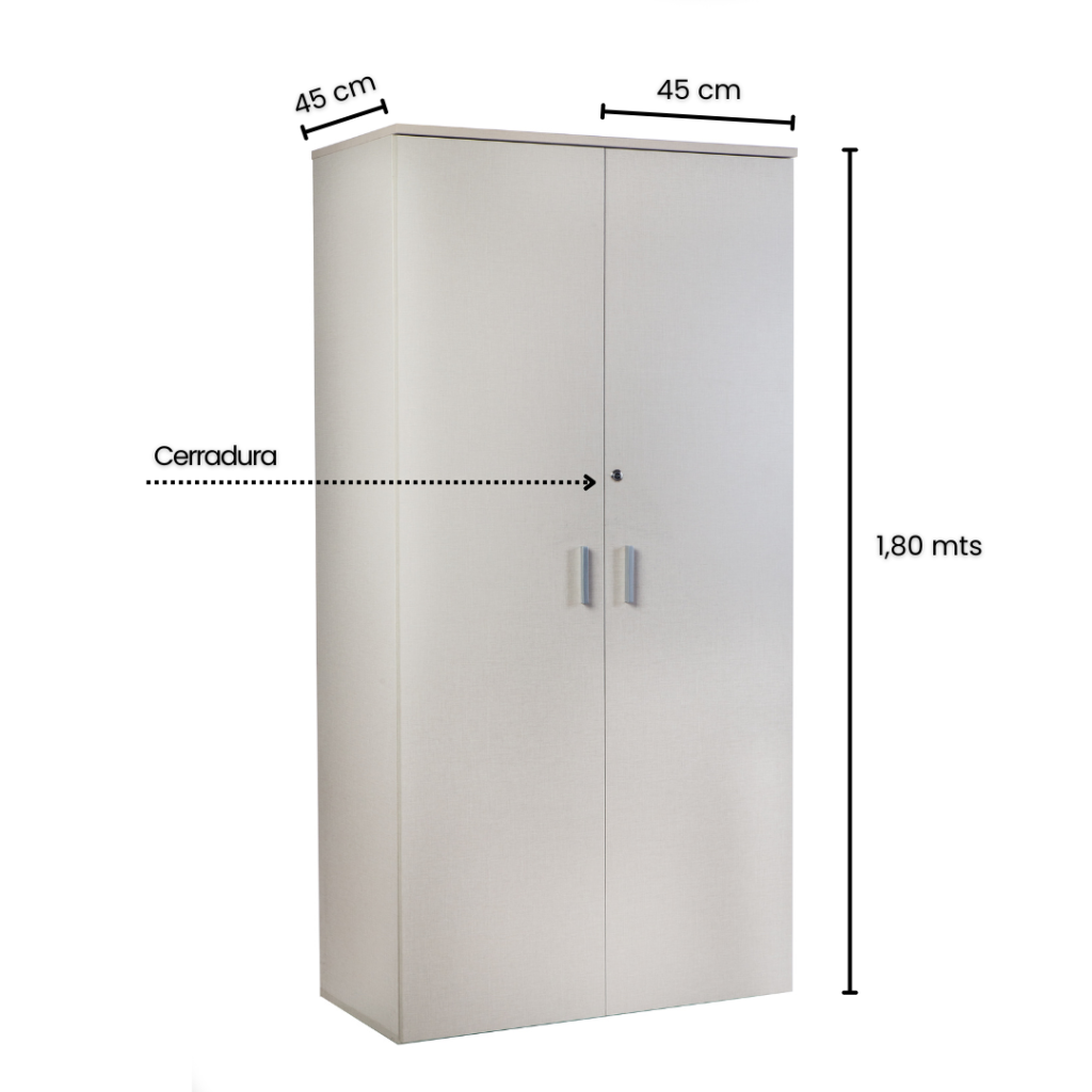 Armario de oficina fabricado en MDF de 18 mm, diseñado para ofrecer resistencia y durabilidad en el uso diario. Incorpora estantes regulables que permiten adaptar el espacio de guardado según necesidad, cantos ABS antigolpes para mayor protección y terminaciones de calidad, y regatones regulables que aseguran una correcta nivelación sobre distintas superficies.