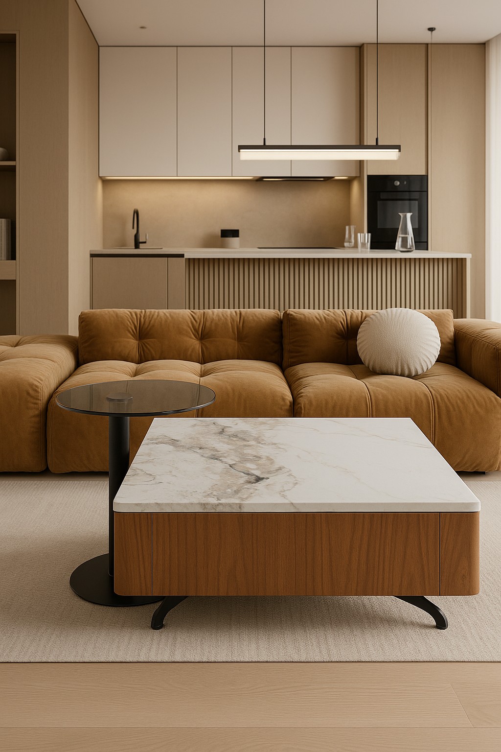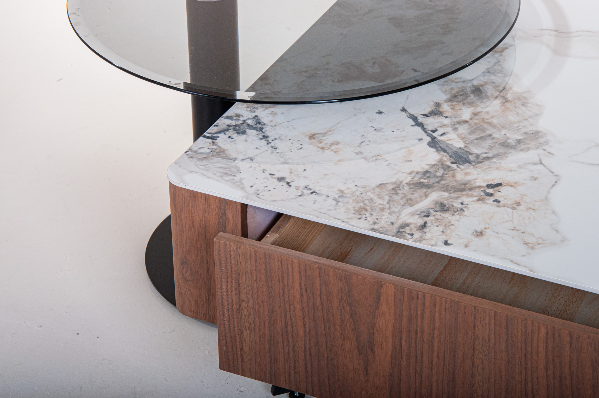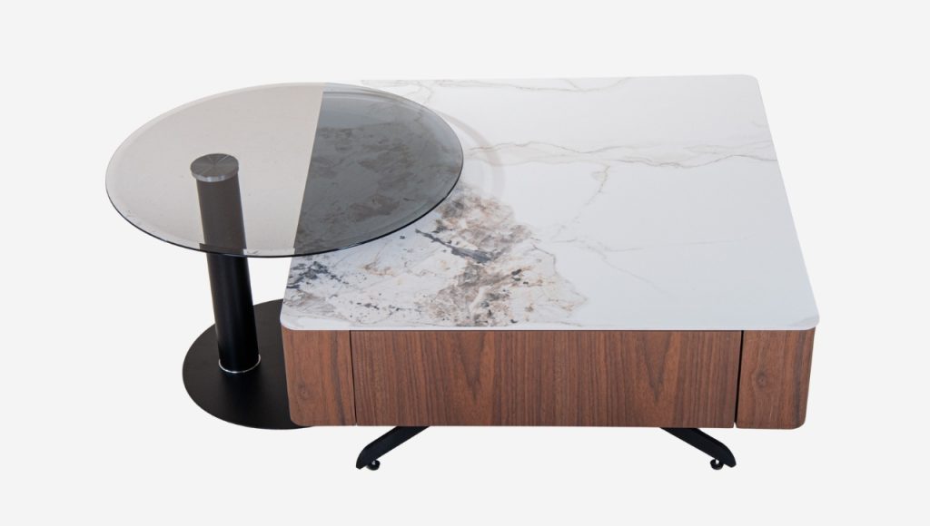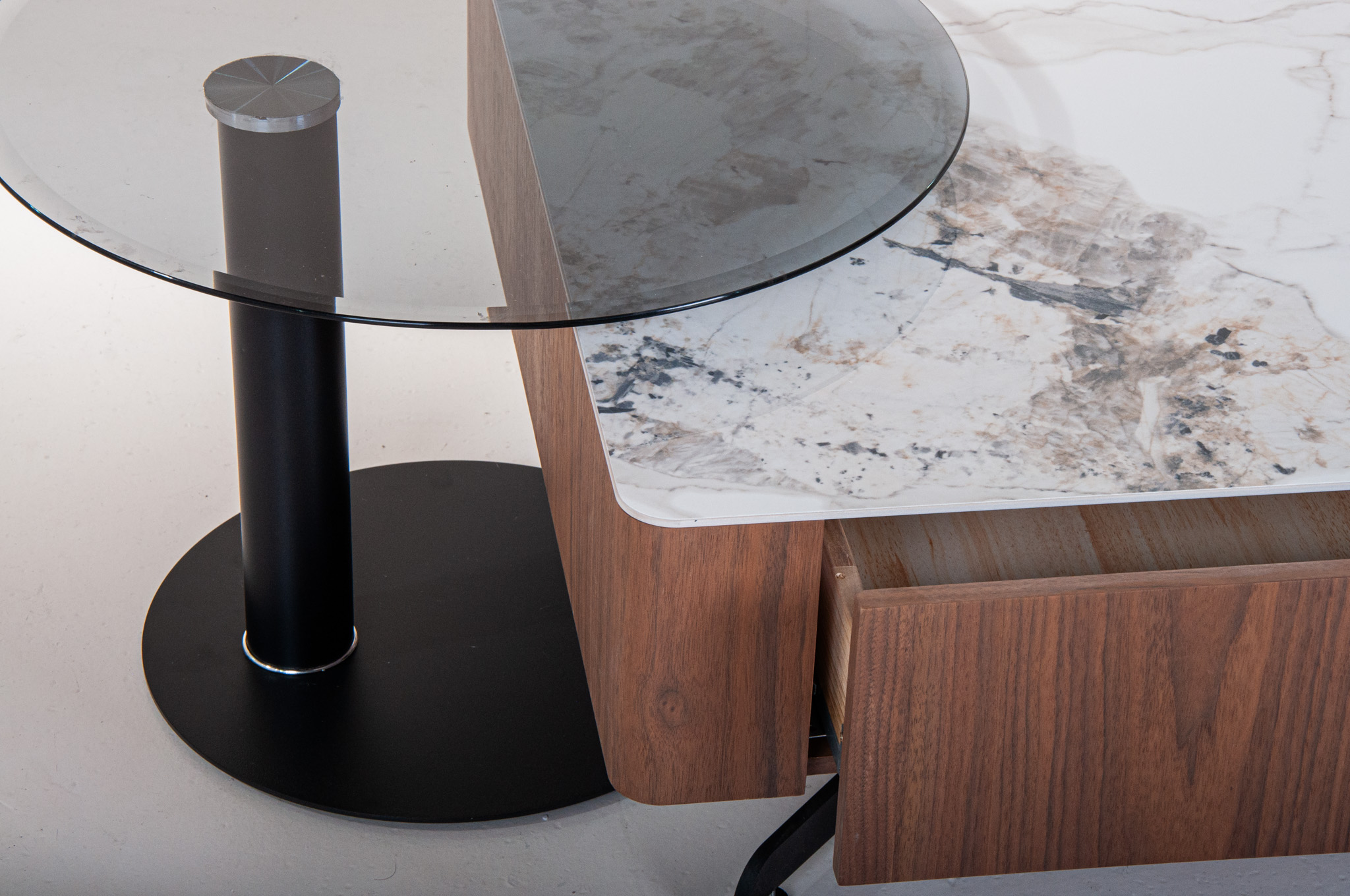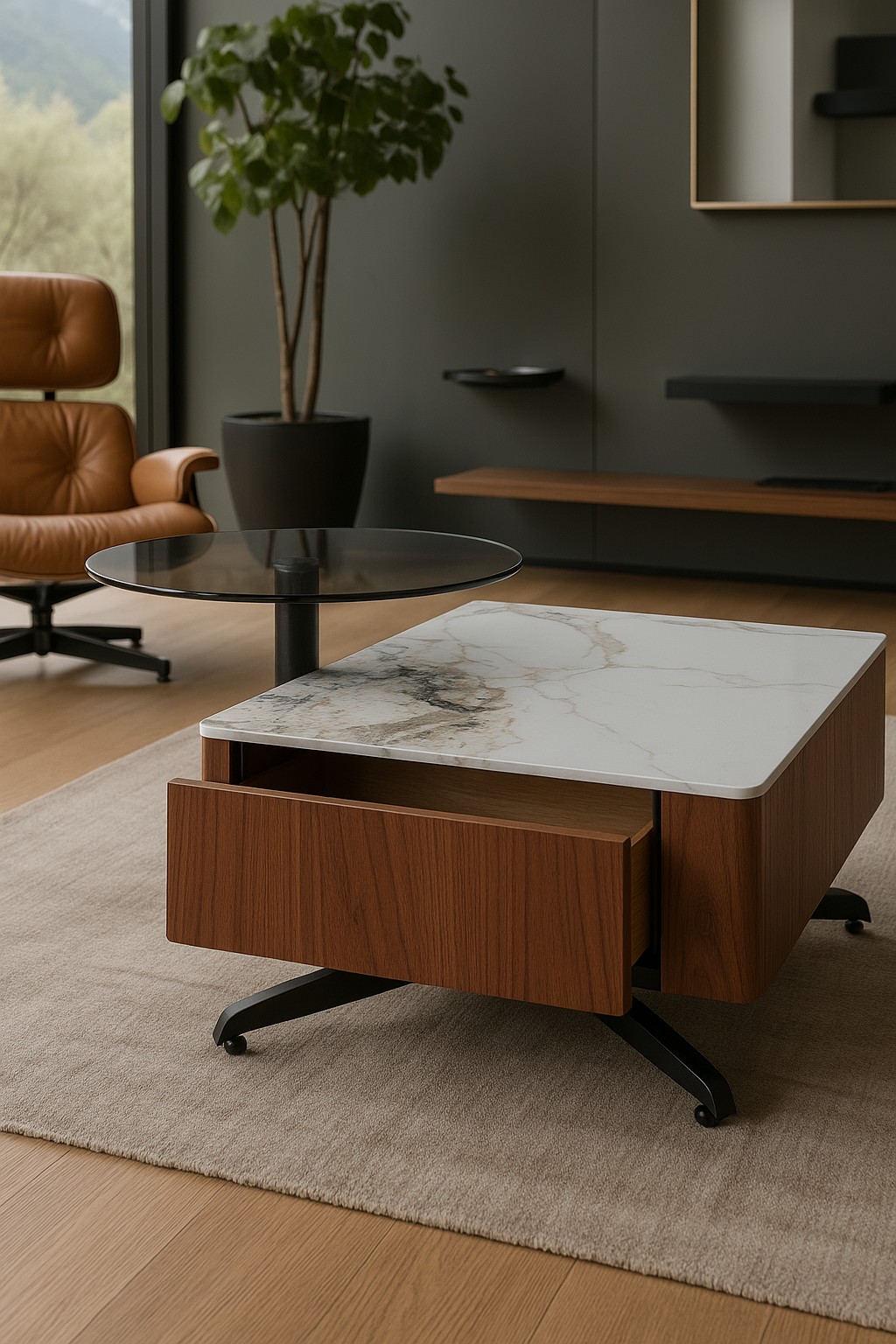 Geo combina geometría y materialidad en una pieza precisa: un volumen cálido en madera que sostiene un plano mineral efecto mármol, acompañado por una bandeja circular de vidrio ahumado sobre columna y base metálica. La estructura es fija, sólida y estable, con apoyos discretos que protegen el piso. El diálogo entre formas (cuadrado + círculo) y materiales (madera, piedra, vidrio y acero) aporta equilibrio contemporáneo al living. Funcional, elegante y de lectura limpia: un verdadero centro de la escena.