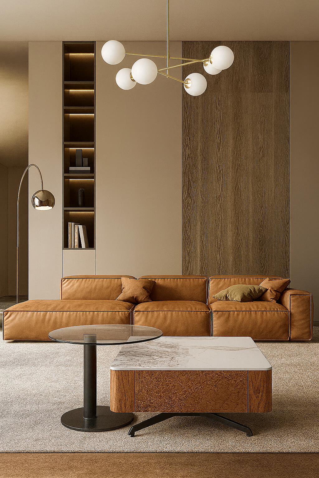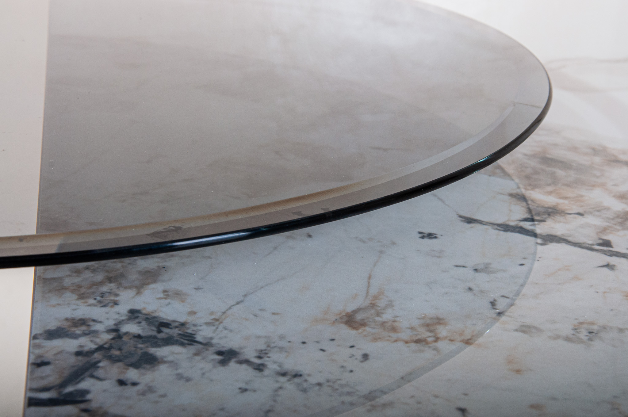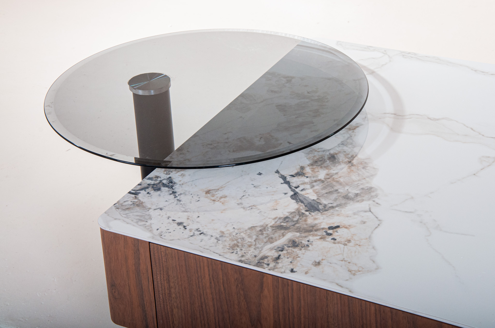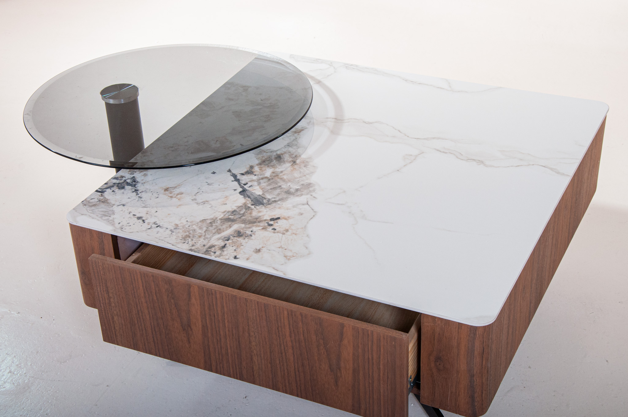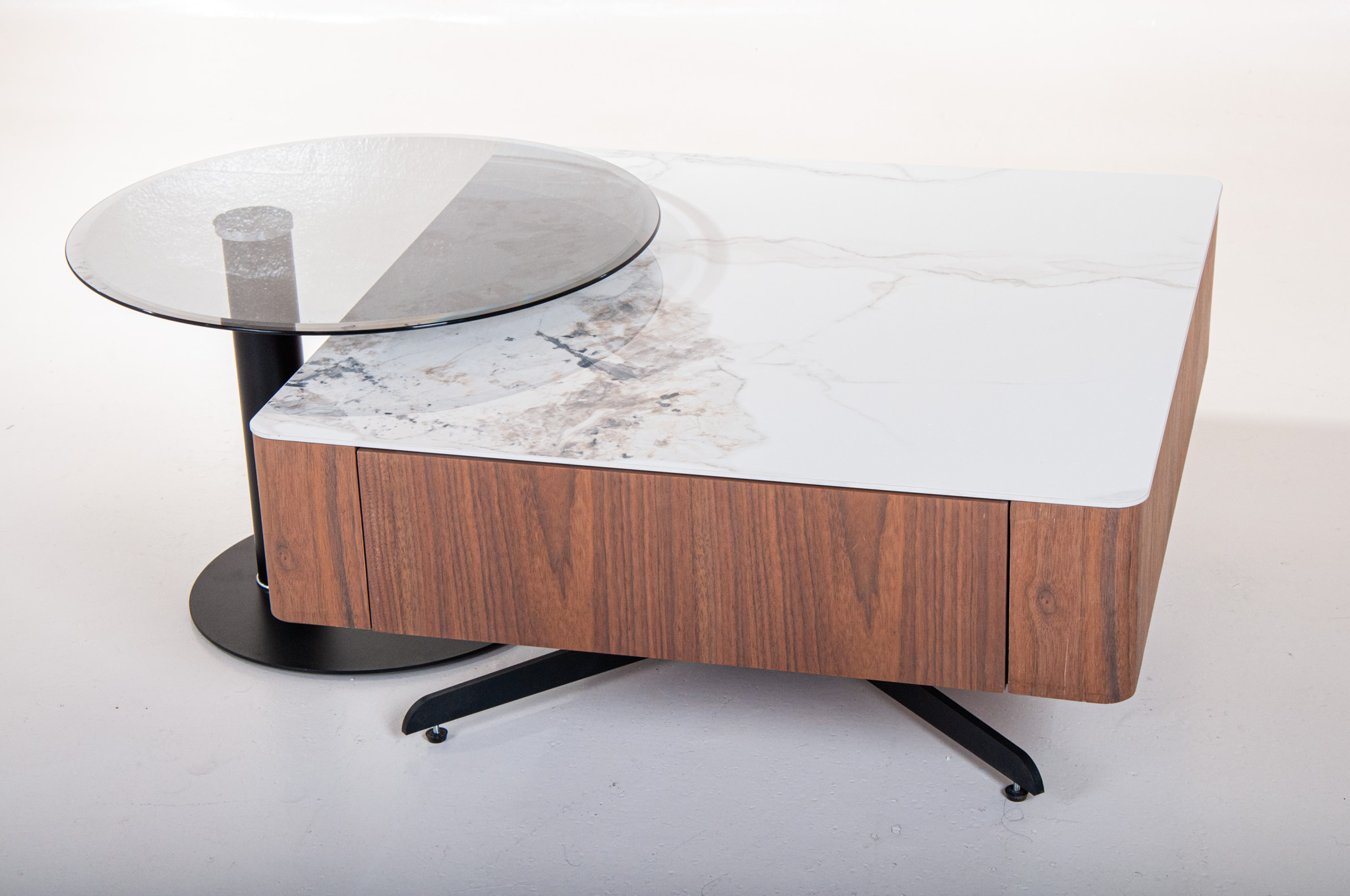Geo combina geometría y materialidad en una pieza precisa: un volumen cálido en madera que sostiene un plano mineral efecto mármol, acompañado por una bandeja circular de vidrio ahumado sobre columna y base metálica. La estructura es fija, sólida y estable, con apoyos discretos que protegen el piso. El diálogo entre formas (cuadrado + círculo) y materiales (madera, piedra, vidrio y acero) aporta equilibrio contemporáneo al living. Funcional, elegante y de lectura limpia: un verdadero centro de la escena.