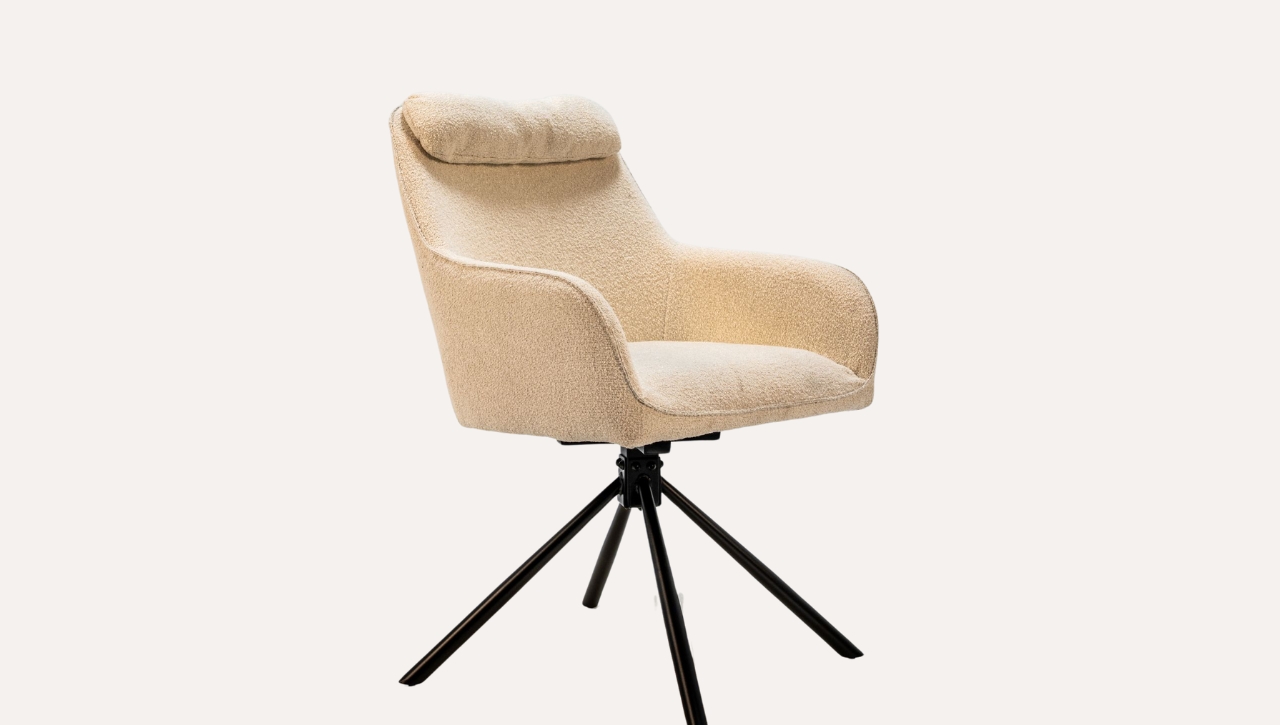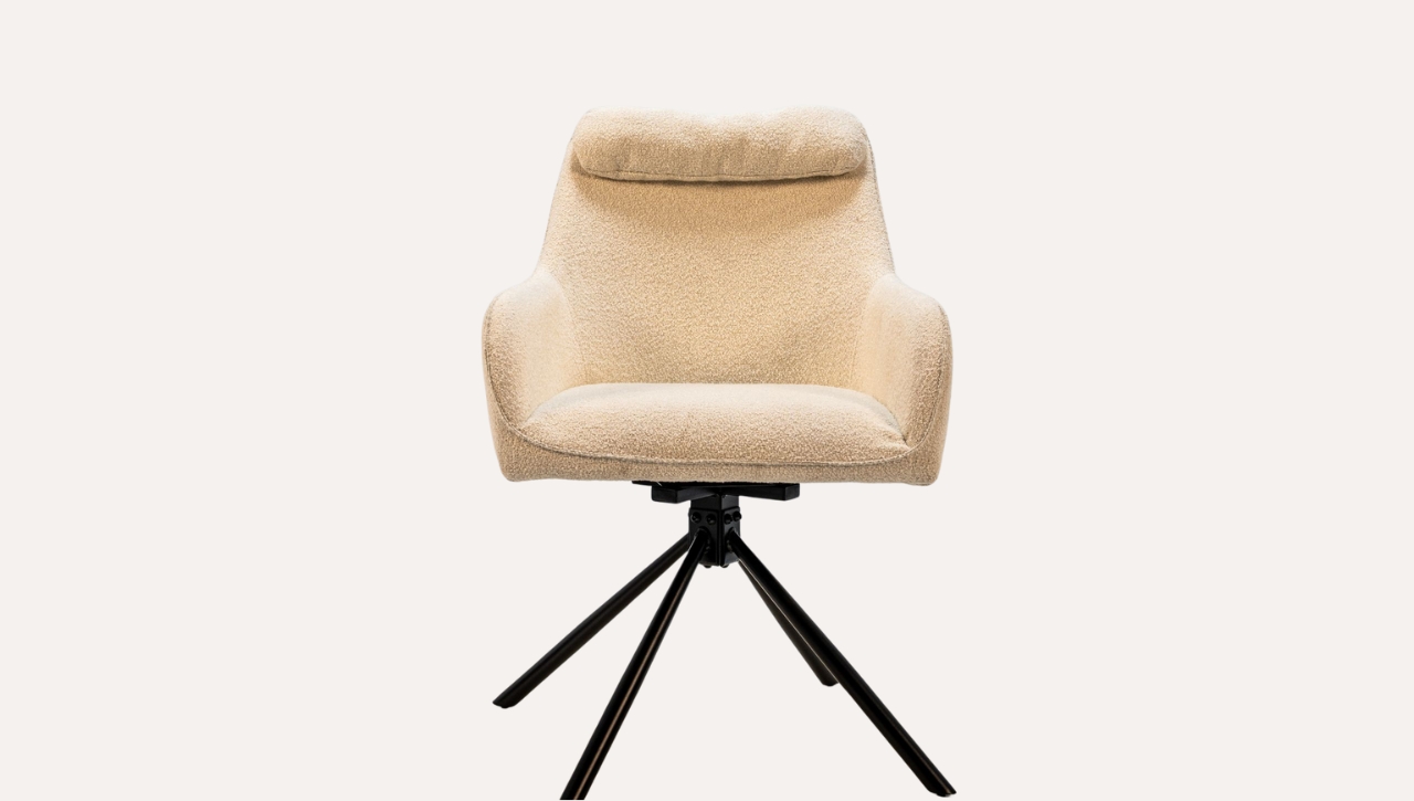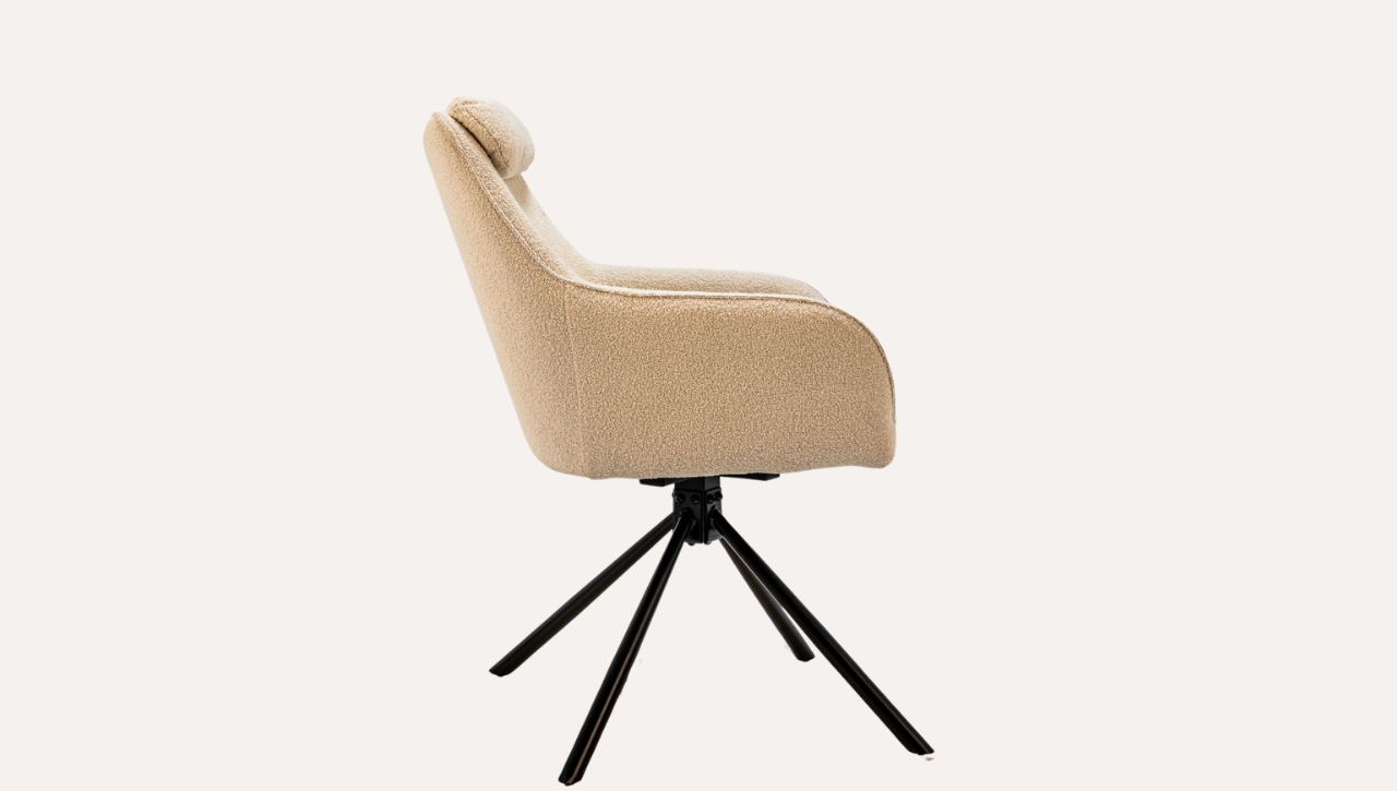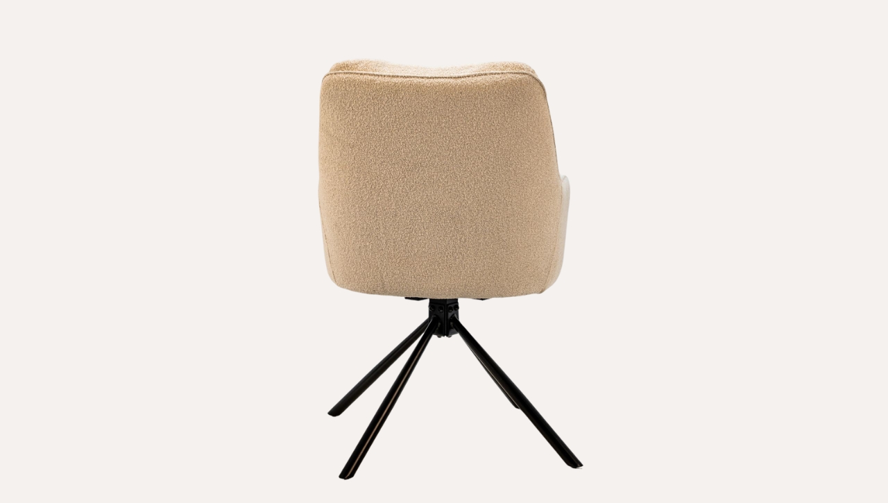 Asiento y respaldo: estructura interna resistente recubierta con espuma de alta densidad que asegura comodidad prolongada. Tapizado en tela tipo bouclé de tono beige, suave al tacto y de gran resistencia, aportando textura y calidez al ambiente.