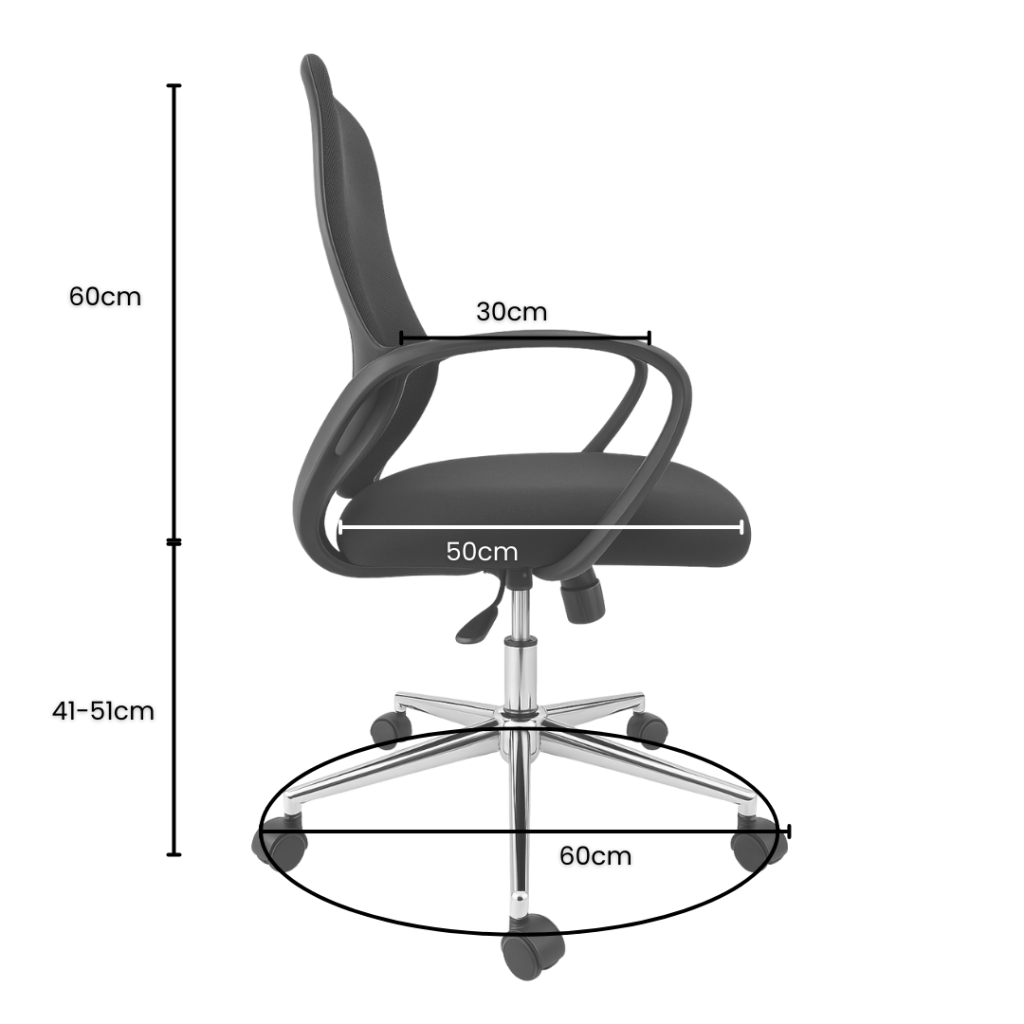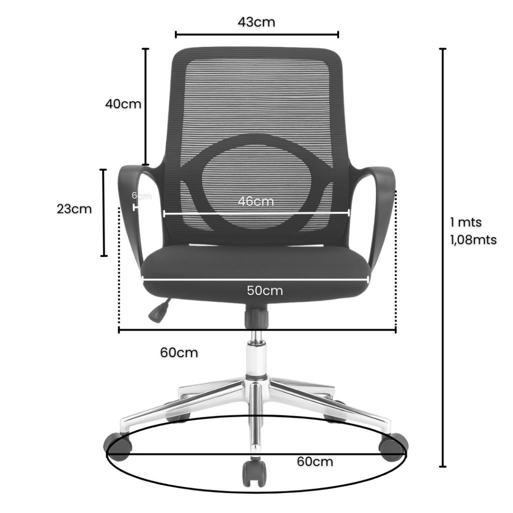 Con un asiento amplio de 50 × 50 cm, brazos fijos y capacidad para 150 kg, el Magna es ideal para quienes buscan comodidad y resistencia. Su altura regulable entre 41 y 51 cm y la inclinación hacia atrás permiten una postura más relajada cuando lo necesitás.