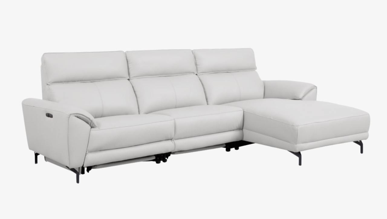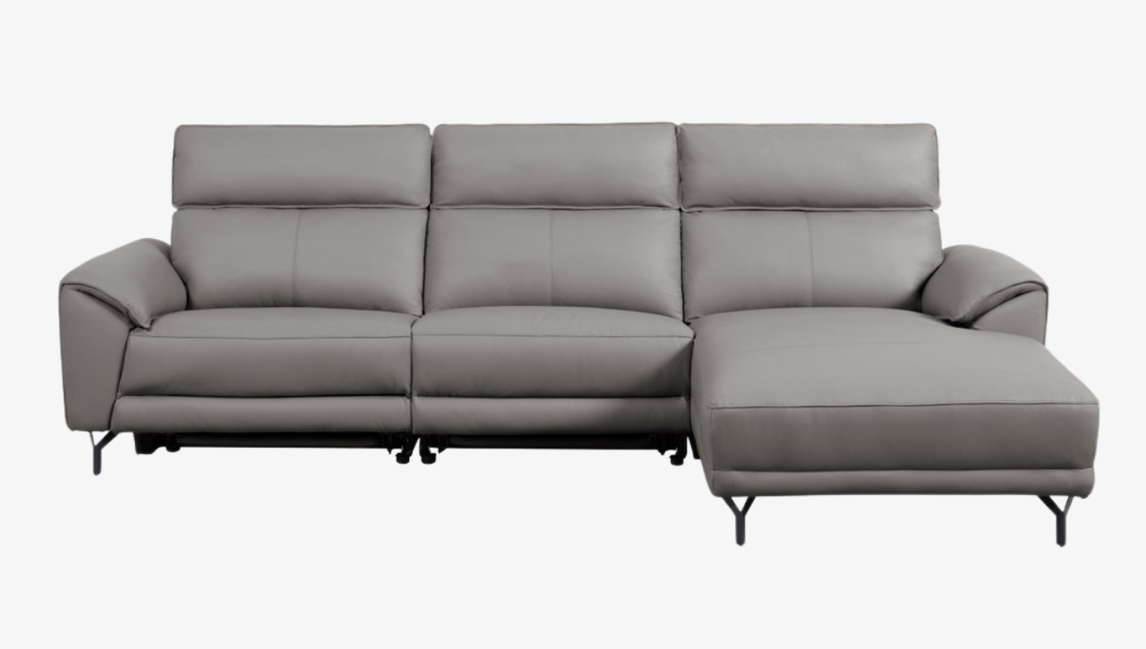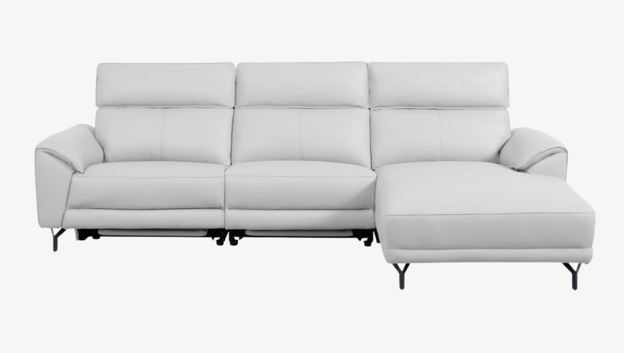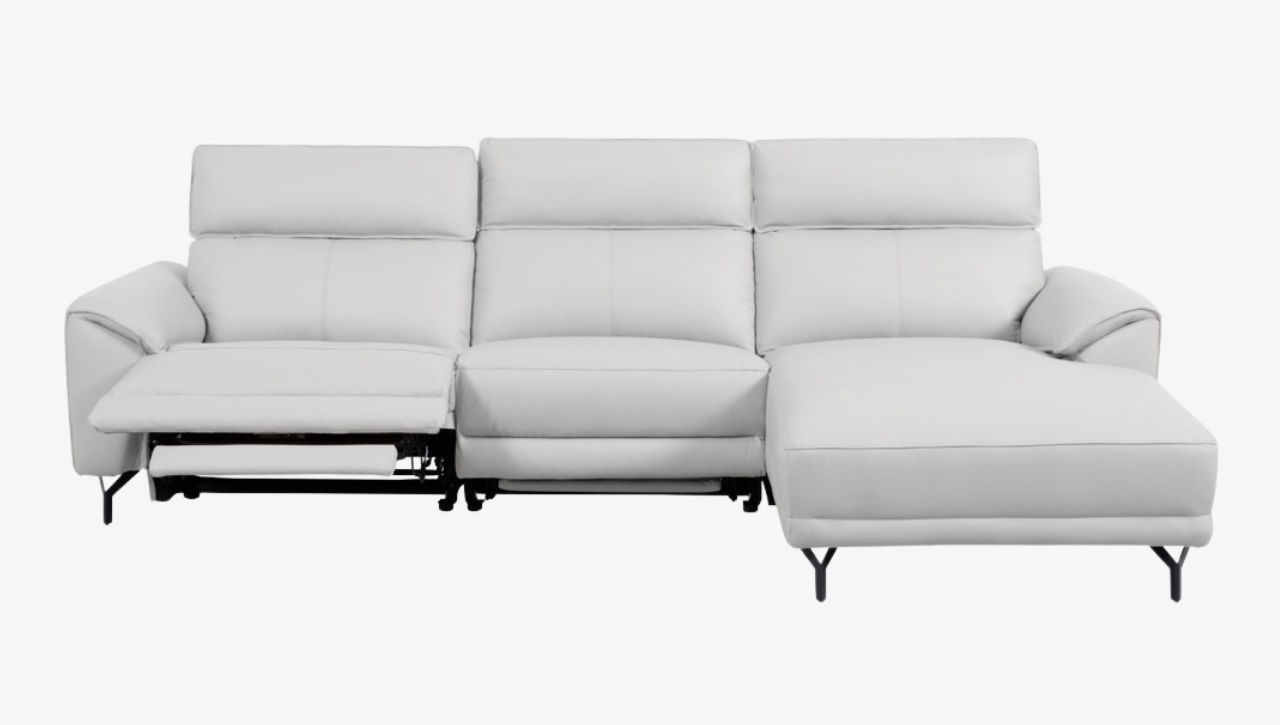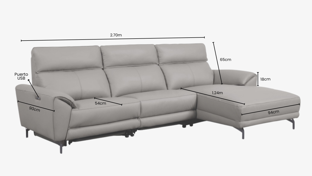 2,10 m de largo y presenta una profundidad de 90 cm en su parte más angosta. Los apoyabrazos, de 88 cm de largo por 18 cm de alto, aportan equilibrio visual y comodidad. La profundidad del asiento es de 55 cm en sus dos cuerpos, mientras que el chaise longue alcanza 1,24 m de largo por 94 cm de ancho. El módulo eléctrico extiende su profundidad de 54 cm hasta 1 m, con una reclinación de 60°, brindando una postura ideal para el descanso. El respaldo, de 62 cm de altura, garantiza un apoyo completo y ergonómico.